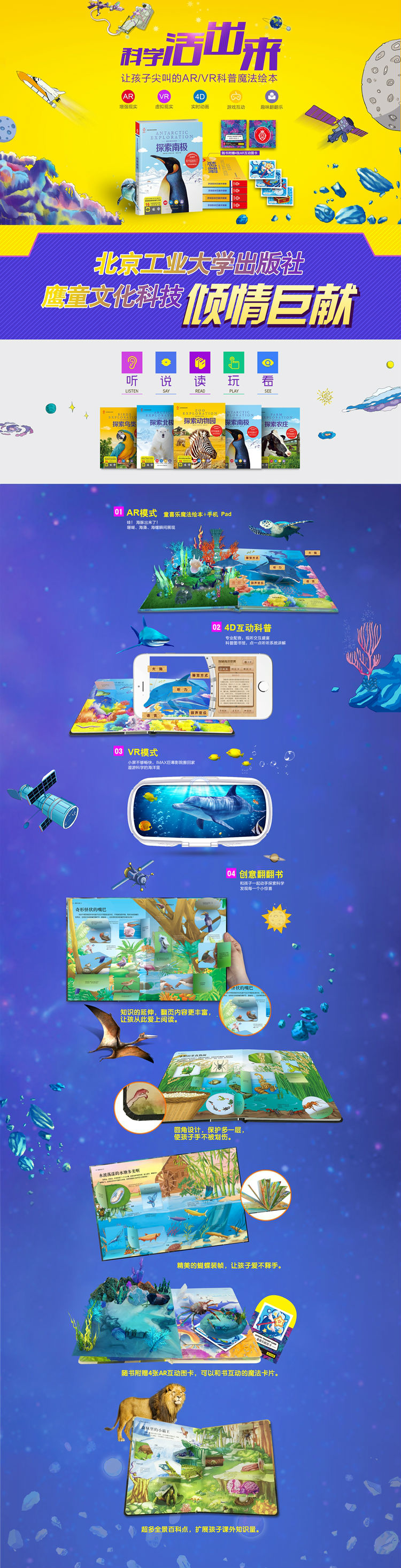 《童喜乐魔幻互动百科》系列利用AR(增强现实)和VR(虚拟现实)技术与科普知识相结合,每册图书16页,包含8个跨页,可以启动AR互动增强现实动画和一个VR虚拟现实场景,让孩子体验全新科技互动阅读的乐趣,让孩子爱上百科知识!