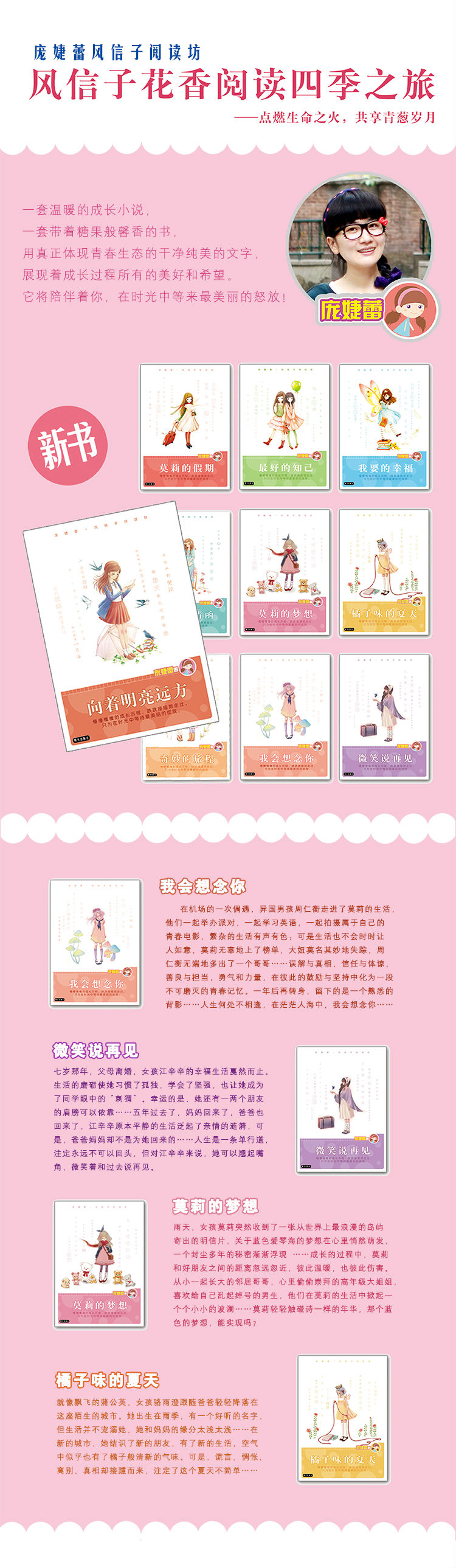 《庞婕蕾风信子悦读坊:莫莉的梦想》雨天,女孩莫莉突然收到了…张从世界上浪漫的岛屿寄出的明信片,关于蓝色爱琴海的梦想在心底悄然萌发,一个尘封多年的秘密渐渐浮现……成长的过程中,莫莉和好朋友之间的距离忽远忽近,彼此温暖,也彼此伤害。从小一起长大的邻居哥哥。心里偷偷崇拜的高年级大姐姐,喜欢给自己乱起绰号的男生,他们在莫莉的生活中掀起一个个小小的波澜……莫莉轻轻触碰诗一样的年华,那个蓝色的梦想。能实现吗?