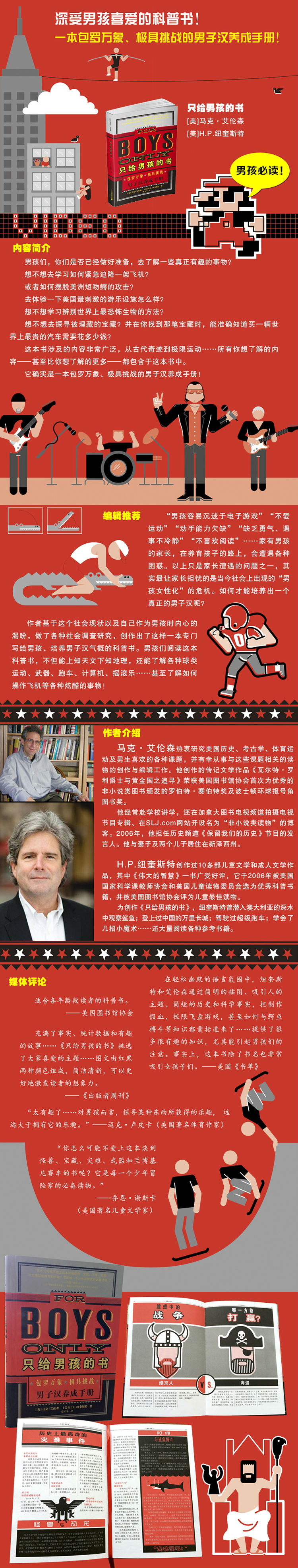 作者基于这个社会现状以及自己作为男孩时内心的渴盼,做了各种社会调查研究,创作出了这样一本专门写给男孩、培养男子汉气概的科普书。男孩们阅读这本科普书,不但能上知天文下知地理,还能了解各种球类运动、武器、跑车、计算机、摇滚乐……甚至了解如何操作飞机等各种炫酷的事物!