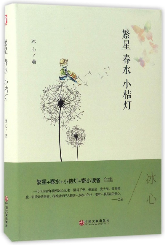 冰心,近现代伟大的诗人、作家、翻译家、儿童文学家。福建长乐人,出生于福州一个海军军官家庭,被称为“世纪老人”。曾任中国民主促进会中央名誉主席,中国文联副主席,中国作家协会名誉主席、顾问,中国翻译工作者协会名誉理事等职。著有小说集《超人》,诗集《春水》、《繁星》,散文集《寄小读者》、《再寄小读者》、《三寄小读者》、《小桔灯》等,主张爱的哲学,“当代散文八大家”之一。《繁星春水小桔灯(精)》收录了两部诗歌《繁星》、《春水》、经典散文《小桔灯》。