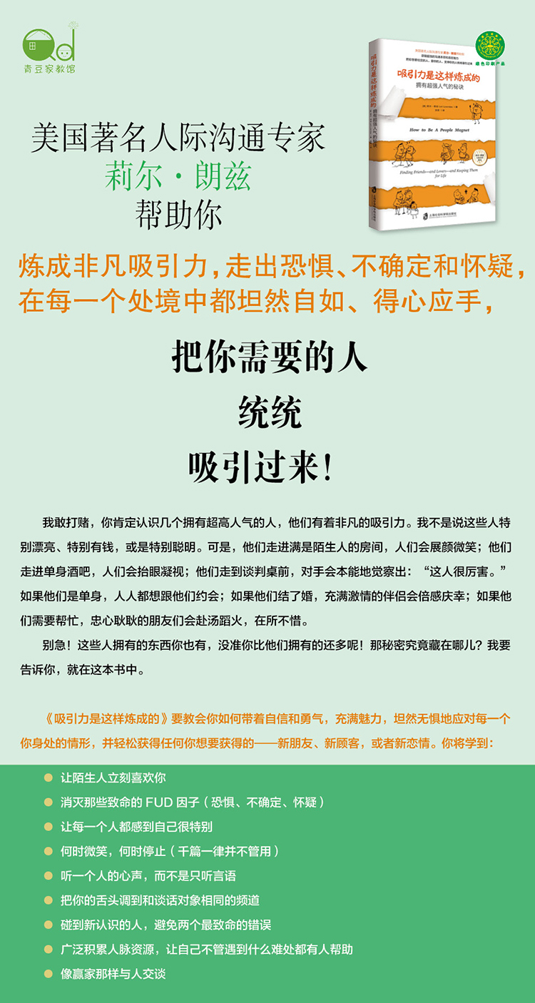 如何让陌生人立刻喜欢你?如何消灭那些致命的FUD因子(恐惧、不确定、怀疑)?如何让每一个人都感到自己很特别?何时微笑,何时停止(千篇一律并不管用)?如何听一个人的心声,而不是只听言语?如何把你的舌头调到和谈话对象相同的频道?碰到新认识的人,如何避免两个致命的错误?如何广泛积累人脉资源,让自己不管遇到什么难处都有人帮助?如何像赢家那样与人交谈?你肯定想知道这些问题的答案,或者你正被友情、爱情、人脉等社会交往方面存在的问题所困扰,那么《吸引力是这样炼成的》所提供的机智、实用、有效甚至有些狡黠的沟通技巧一定会令你受益匪浅,因为它们并非空穴来风,而是有社会学研究的支持,又被上千人的应用所证实。朗兹女士善解人意,全书幽默风趣,必定带给你欢笑与思考,也会让你产生立刻实践的渴望与勇气!
